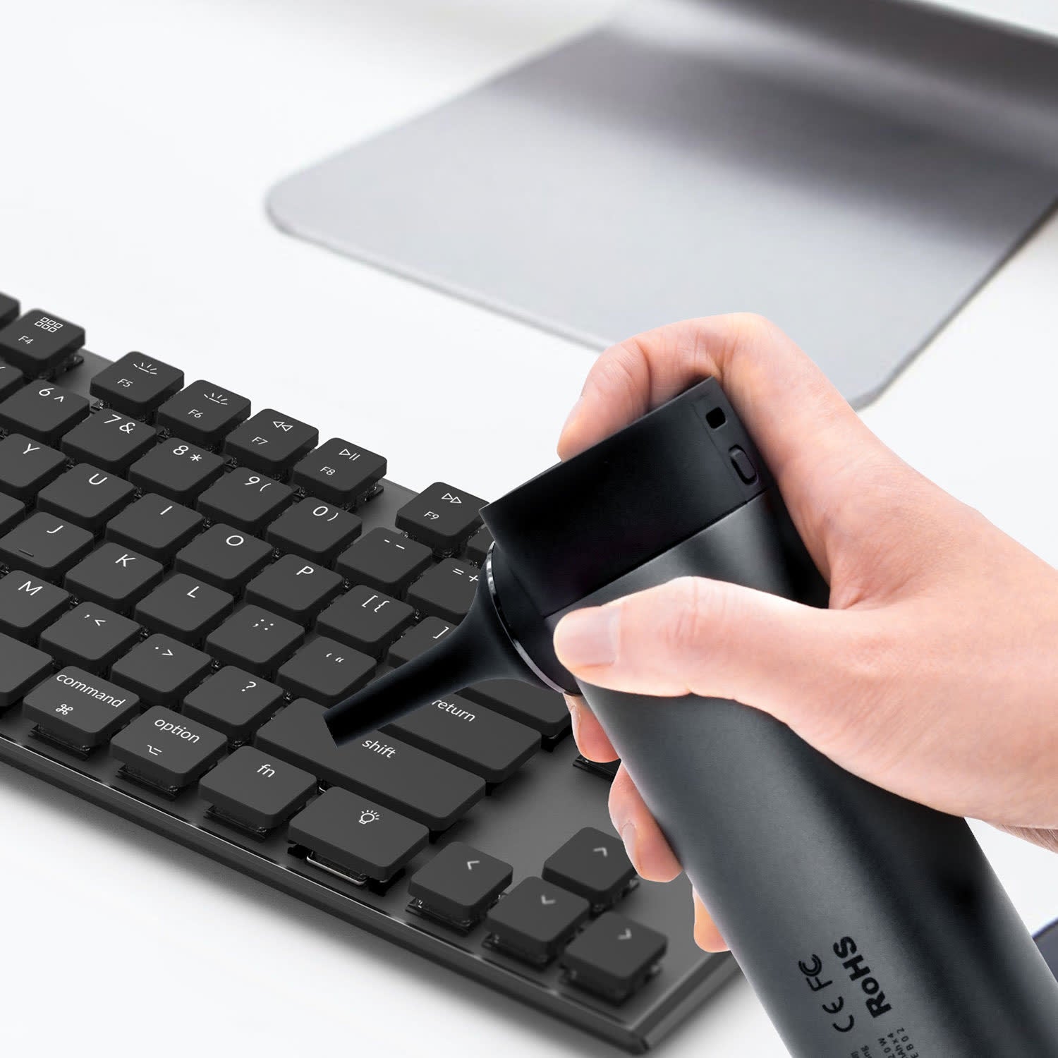 The top-mounted light helps illuminate and better clean dust on electronic devices. The touch control switch also indicates remaining battery level: white light for 50% or more, yellow light for 5%–50%, and red light when below 5%, signaling that it’s time to recharge.